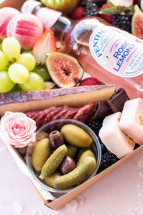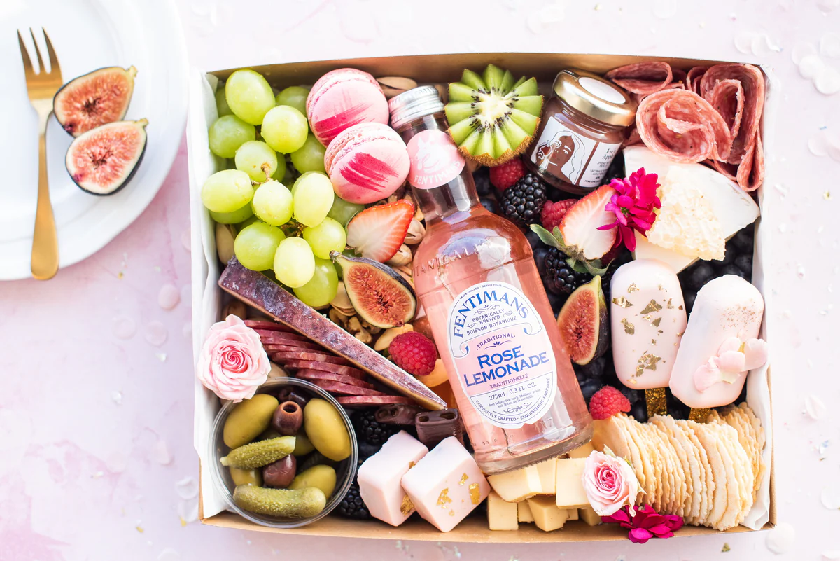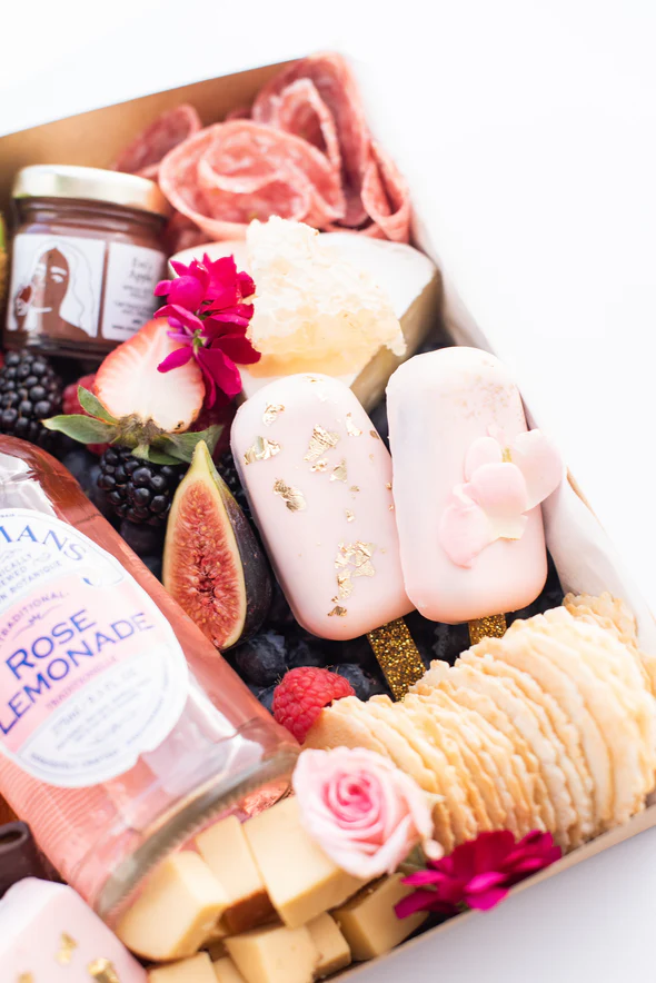 Each Small Graze Birthday Box comes with a bottle of Fentimans Rose Lemonade, two charcuteries, 3 cheeses, 2 handcrafted macarons, 2 handcrafted chocolate gold foiled truffels, 2 handcrafted gold foiled cake pops, crackers, a jar of artisan preserve, fresh fruit, apricots, olives and cornichons, chocolate wafers, nuts, and floral for decoration.