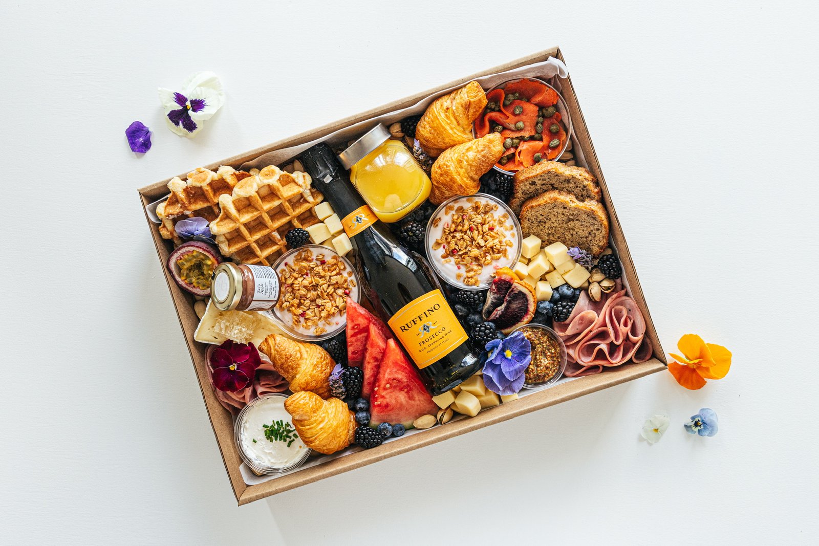 Elevate your Easter celebrations at home this year with this drool worthy box filled with all of the brunch favorites! Each box includes: Belgian waffles, mini croissants, homemade banana bread, yogurt parfaits, artisan preserve, selection of cheeses, cotto ham, honeycomb, smoked salmon lox, capers and cream cheese, fresh fruit, nuts & edible floral. Each brunch box comes complete with a 375ml bottle of Prosecco and OJ for Mimosas! Medium Feeds 2-4.