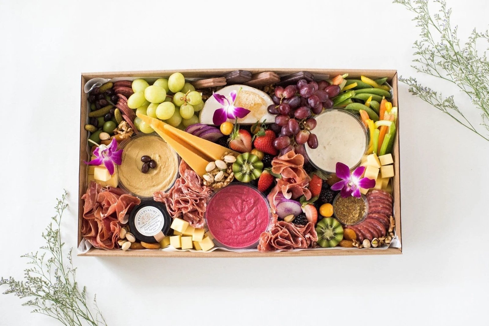 Each box comes with a selection of charcuteries, cheeses, wholesome dips, an artisan preserve, crudités, fresh fruit, dried fruit, olives & cornichons, nuts (walnuts and pistachios), chocolate, and floral.