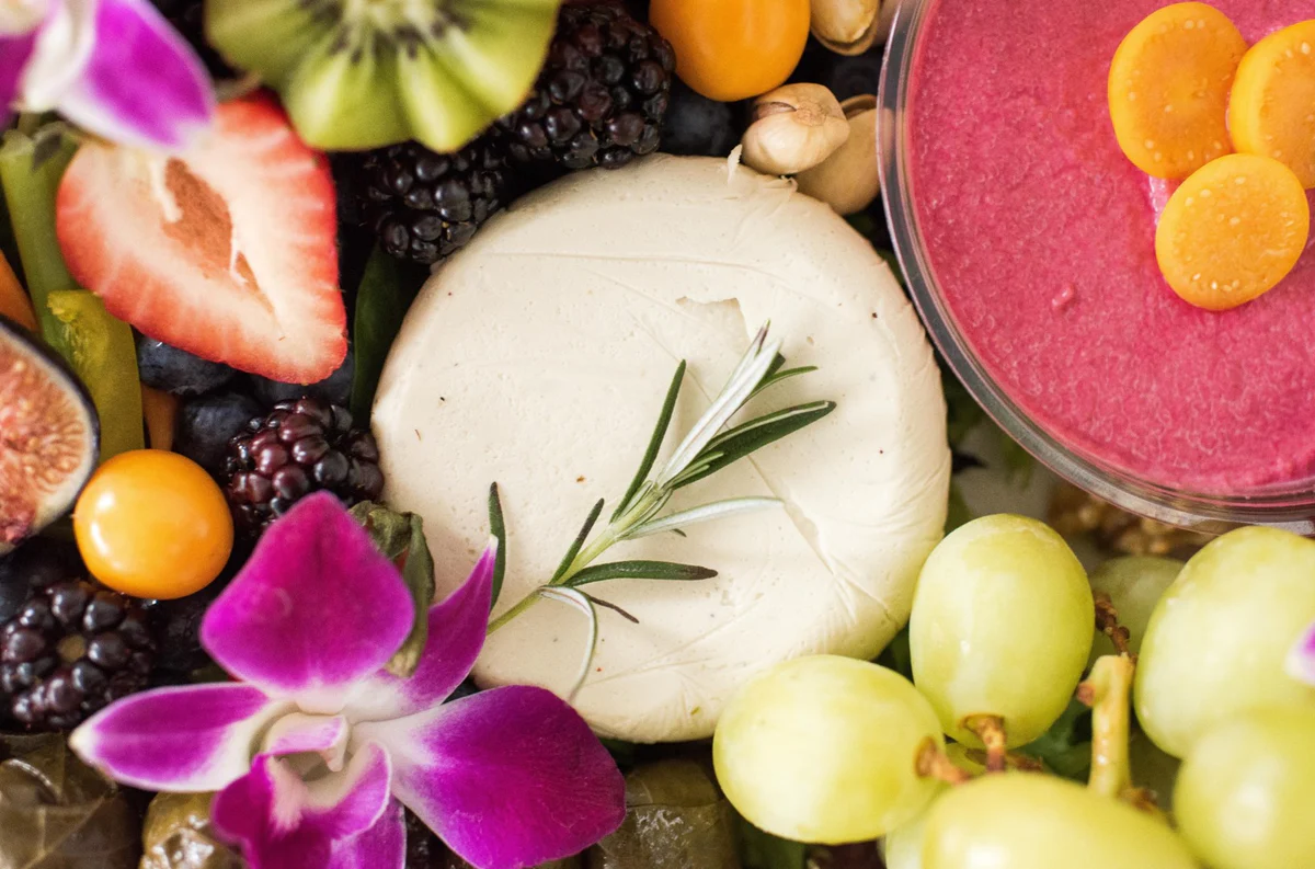 Each box comes with a selection of cheeses, wholesome dips, an artisan preserve, crudités, fresh fruit, dried fruit, olives & cornichons, nuts (walnuts and pistachios), chocolate, and floral.
